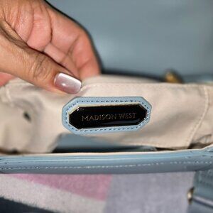 Made of faux leather which is very soft and the bag itself is lightweight but structured.