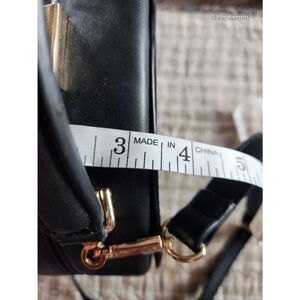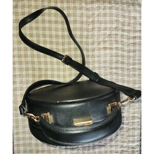DESCRIPTION: round hard side bag with gold clasp, a short handle and a crossbody strap included