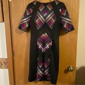 This is a like-new Madison Leigh stretchy dress, maroon, peach, white, gray and black, size 6. Worn once, and it’s very comfortable! See photos for chest, stomach and hip measurements.