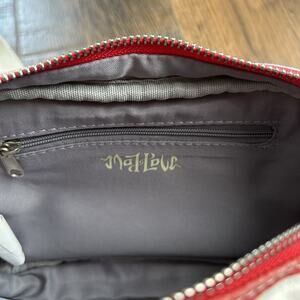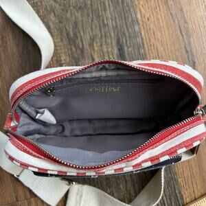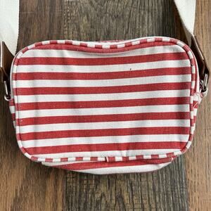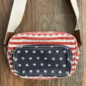 Madlove crossbody bag with red and white stripes and navy blue stars in a USA flag design. Features an adjustable canvas strap, front zip pocket, and main zip compartment with interior zipper pocket. In very good condition with light signs of wear.