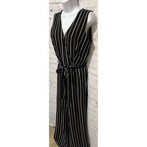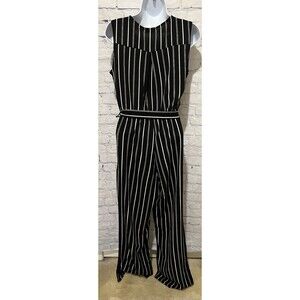 The Madrag Black and White Striped Sleeveless Pant Jumpsuit is a stylish and versatile one-piece outfit perfect for various occasions such as travel, parties, casual wear, and workwear. Made of polyester, this jumpsuit features a classic black and white striped pattern, a V-neckline, and a unique tie-waist closure. The sleeveless design and straight leg style offer a modern and comfortable look, making it a must-have for any woman's wardrobe. There is no size tag - please use measurements. 19 inches pit to pit, 32 inch inseam and 60 inches long. Smoke free home.