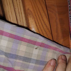 Boston Trader's Madras style textile, made in India. Button down tab collar. Hand stitched inner label has come unraveled, size is unclear. It feels like a large. 23" across at armpit, 29" from shoulder to tail. Small schmutz on left sleeve (pictured).