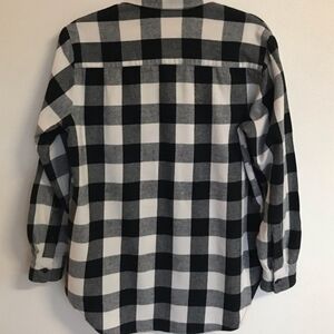 Black and white check plaid button down shirt. Oversized, great for wrapping around waist or just to layer and wear. Side split hem.2 yellow stains in upper back, doesnt come out with stain streating. Tomboy, hipster, indie sleaze, grunge, 90's