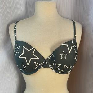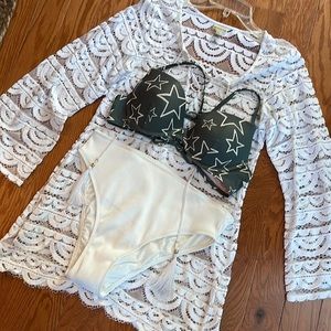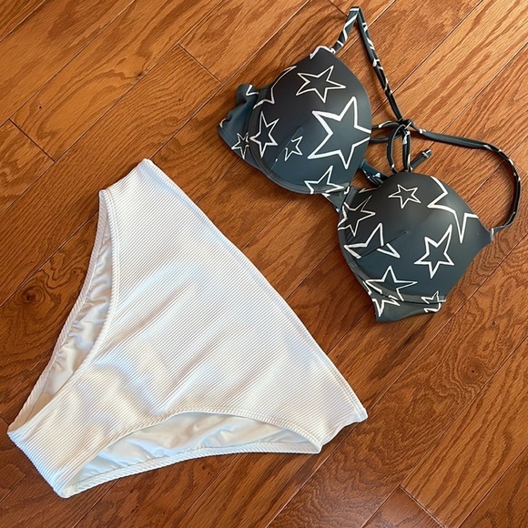 Brand new Mae Bikini size large Grey Star top with underwire and adjustable back with white double lined bottoms NWOT