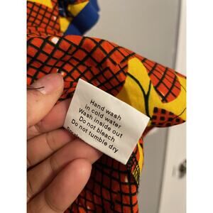 Features bold multicolor African-inspired geometric print (red, yellow, and blue) with grid and zig-zag accents