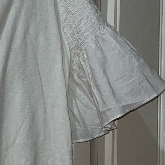 This elegant white top features stylish ruffle sleeves, perfect for any occasion. Its classic design offers a versatile addition to your wardrobe. T-shirt material but with crisp cotton smocking and ruffle sleeves. Fits more like a large.