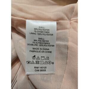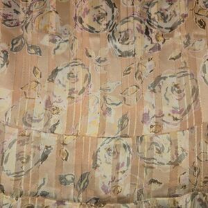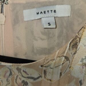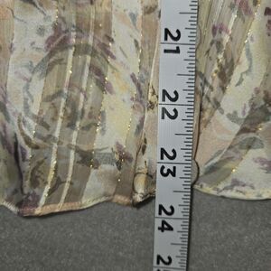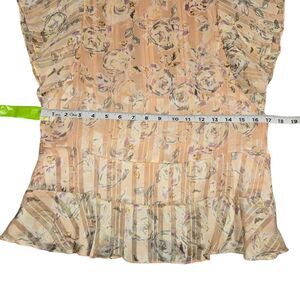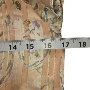 Maette Womens Small Top Peach Blouse Floral Peplum Short Sleeve Lightweight and Lined. In good, pre-owned condition with no noted rips, tears or stains. Gold vertical threads add a little bit of shine and sparkle. Measurements in description and pictures with ruler. Please see pictures as they are considered part of the description.