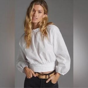 Puff sleeve blouse with embroidered polka dots all over. Cropped. 100% cotton. Frill neckline with a keyhole back closure. In excellent condition, no notable flaws!