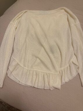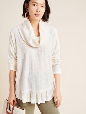 Cream cowl neck sweater with a relaxed silhouette. Lightweight knit with subtle ribbed texture. Long sleeves and a ruffled hem for a feminine touch. Versatile piece for layered looks.
