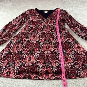 Red, cream, purple and metallic gold patterned dress has lined body with ample stretch. Features bishop sleeves, and an elastic waist that stretches comfortably to 18.5” across laid flat. Removable matching cloth belt, and hidden slit hip pockets.