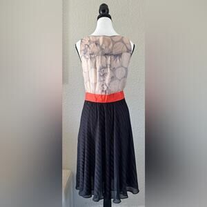 Unique and rare Maeve dress for Anthropologie, constructed in 100% silk and fully lined. This piece features a semi-sheer abstract grey chiffon bodice with keyhole neckline and self-tie, contrasted by a bold red-orange empire waist and a layered black skirt with sheer overlay. Inside is a black-and-white vertically striped lining, adding visual intrigue with movement. Side zip. A standout example of early 2010s Anthropologie design — elegant, edgy, and flattering.