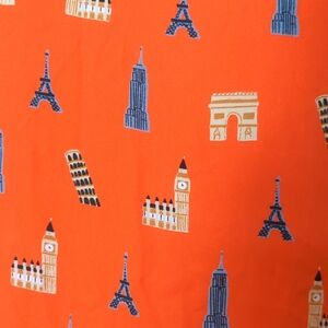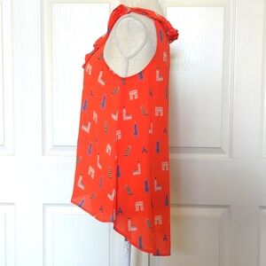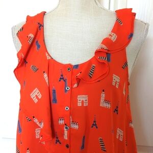 Vibrant red blouse by Maeve. Features iconic architectural print. Stylish and eye-catching. Partial button down front. Ruffle neckline. Fun landmark print. Flowy fit. Polyester