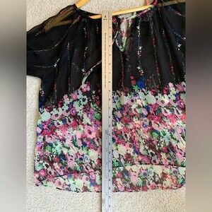 Sheer black chiffon with floral design top. Cold shoulder and gathered elbow sleeves. Unlined. Cool and airy.