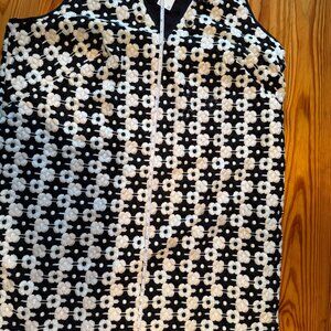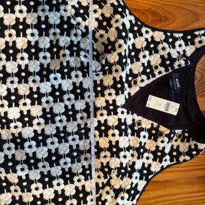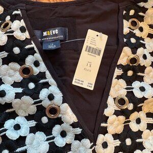 This is a cute sleeveless dress, new with tags, from Anthropologie. It has a woven overlay that is see through to the underneath black lining. Comes to above the knees with a scalloped edge. This was a little bit snug across the chest for me and thus, I'm selling it. Nice silver grommet accents along the neckline. From a smoke free home. Very nicely made garment.