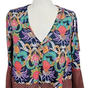 Maeve Anthropologie Blouse 4 Black Multi Floral Tie Button Front V-Neck Top