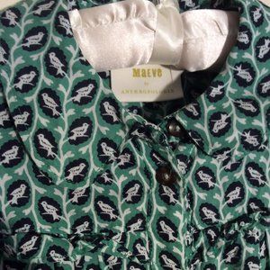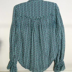 Maeve Button down blouse, round collar, 100% modal, navy, green and white print. Excellent used condition- no flaws.