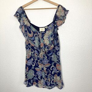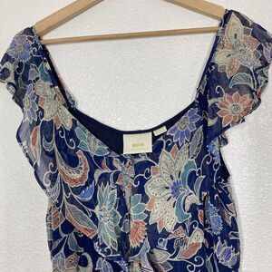 Maeve Anthropologie Blouse Womens 10 Blue Floral Ruffle Sheer Lined Metallic