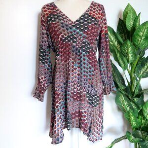 ⭐This Maeve Anthropologie boho mini dress features a gorgeous multicolor geometric fan print in shades of red, green, blue, and cream. Designed with a flattering V-neckline, long sleeves, and a flowy hemline for a chic and feminine silhouette. The lightweight rayon-viscose blend offers comfort and effortless drape, perfect for layering or wearing on its own.