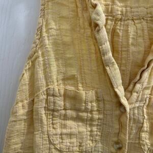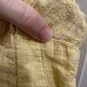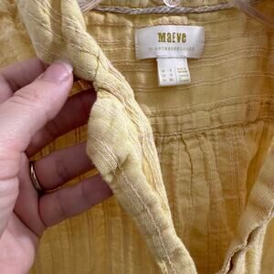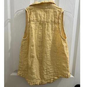Maeve by Anthropologie sleeveless button front top. Beautiful light yellow, almost light enough to be a pastel butter yellow. Textured fabric with white lines woven in. 2 small chest pockets. Collared V-neckline. Length is longest in front, with rounded hem that’s shorter at sides. Size 0. Good used condition. One small stain as shown in close-up. 93% linen/7% cotton. Machine washable. Feel free to make a reasonable offer. Or browse & message me for a great bundle deal!