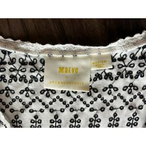 The Maeve Anthropologie Cammie Embroidered Eyelet Peplum Tank Top in size M is a stylish and versatile addition to any woman's wardrobe. This sleeveless top features a geometric white pattern with embroidered accents, a scoop neck, and wide straps for a comfortable fit. Made from a blend of polyester and viscose, it is lightweight and breathable, making it perfect for summer, fall, and spring seasons. The relaxed fit and pullover closure make it easy to wear for various occasions, from casual outings to parties or travel. With a blend of bohemian and classic themes, this tank top by Maeve is a timeless choice for trendy women.