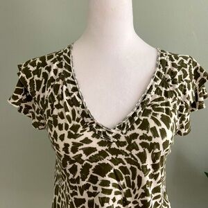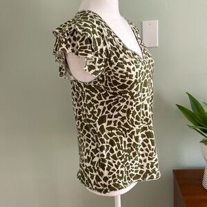 This light and airy tee features a V-neck and ruffle sleeves. It is a green print on a white background. 60% organic cotton and is machine washable. It was worn only a few times and is in like new condition. Size Small