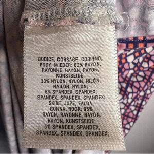 Beige with pink, navy geometric print.