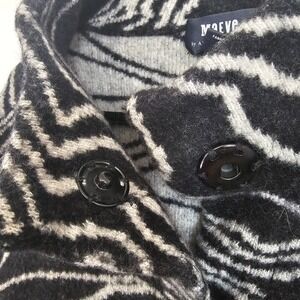 Maeve for Anthropologie "Eunice" funnel neck wool coat/cardigan. Bold black and white zebra-like print. Oversized snaps for closure on this open front coatigan. Perfect for outerwear or layering. Front pockets. The stand up collar gives structural appearance. Heavyweight wool blend material. Very warm. Can be dressed up or down.