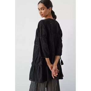 A lightweight black cotton dress featuring intricate eyelet embroidery and a tie front closure.