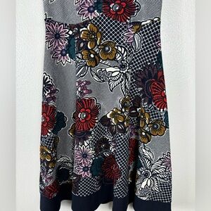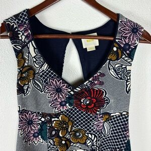 Maeve Anthropologie Fairchild Floral Scoop Neck Sleeveless Mini Dress in the size Women's XS. This dress is a fit and flare style and sits right above or just at the knee depending on height. It is navy with a multicolored floral pattern and a large keyhole back opening with a top pull through button closure. The dress is lined and has plenty of stretch with spandex being in the material makeup, so it is comfortable as well. It is in excellent preowned condition and has no flaws to note.