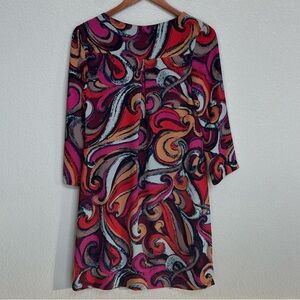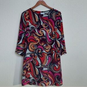 Bold and artistic swirl print in a mix of red, orange, pink, and cream. This abstract shift dress features 3/4 sleeves, full lining, and a flattering back pleat detail. A vibrant choice for fall or holiday events.