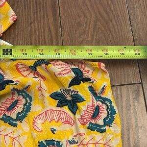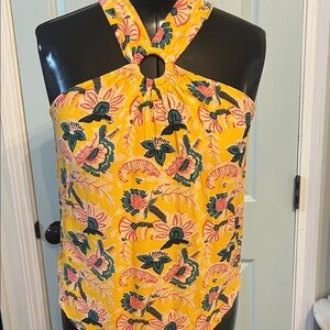 Vibrant floral halter top featuring a keyhole design. Bright yellow with pink and teal accents.