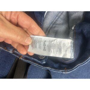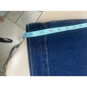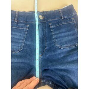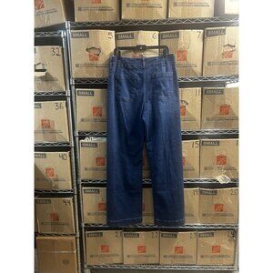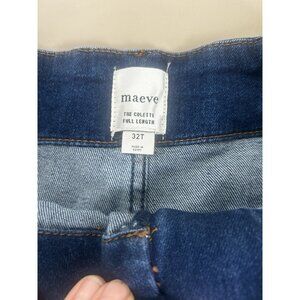 Retail $140 The Maeve Anthropologie Jeans for women in size 32 tall feature a high-rise wide-leg fit in a dark denim wash. These stylish jeans are designed with a solid blue color and a cropped length of 25 inches. They are accented with a zipper and button closure, and have a 5-pocket design with a patch pocket detail. Ideal for all seasons, these Anthropologie jeans are perfect for a hipster, designer, beach, bohemian, city, or retro look, offering comfort and stretch for a fashionable yet versatile wardrobe staple.