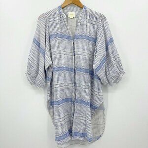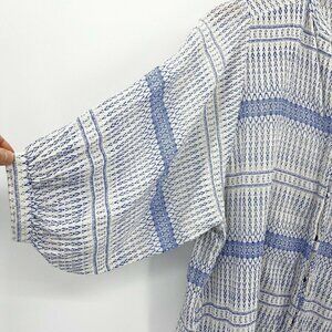 Anthropologie - Maeve - Lena yarn dyed tunic button front top or it could be worn as a shirt dress. Material is 100% cotton, white with blue print detail. Antique bronze buttons, V neckline with band collar. 3/4 length balloon sleeves. Side slits. Size XS, very flowy oversized fit. Approximate (unstretched) flat lay measurements: