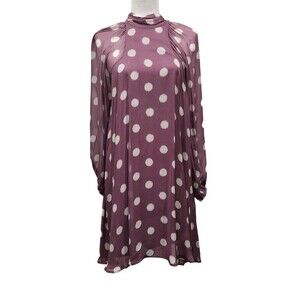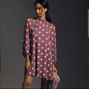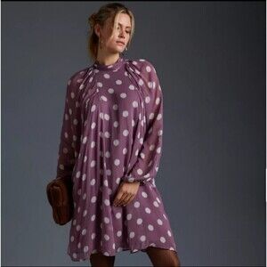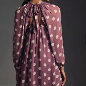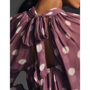 Maeve Anthropologie Mauve Polka Dot Tie Neck Balloon Sleeve Open Back Dress, S