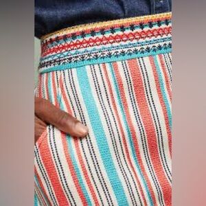 Bring a boho vibe to your wardrobe with this Maeve by Anthropologie mini skirt in size 8. Featuring a vibrant mix of stripes and intricate woven details, this colorful piece is perfect for casual outings or dressed-up occasions. Designed with both style and functionality, it has side slant pockets, back welt pockets, and a back zip closure. Pair it with your favorite blouse or tee for an effortlessly chic look. Pre-owned and in excellent condition, this skirt is ready to brighten up your closet!
