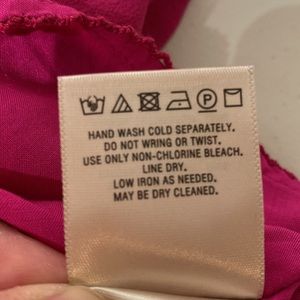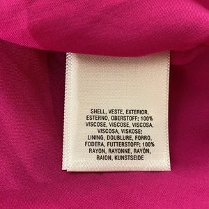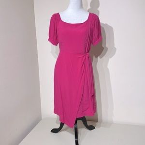 Rayon/viscose fabric in gorgeous raspberry! Elastic gathering detail at shoulders and sleeves. Wrap front with tie at waist. Asymmetrical hemline. NWT
