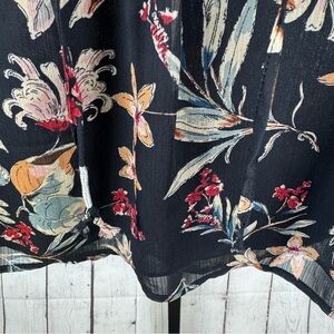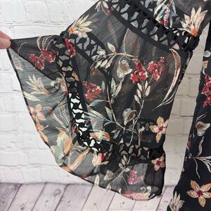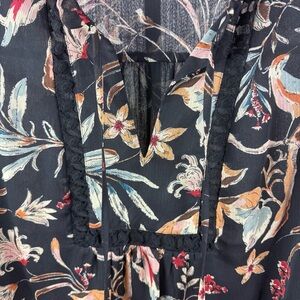 Maeve blouse size XS. This is the “Odette” style top. Black with a flower and bird print. Bell sleeves. Semi sheer. Good condition, except for missing silver thread and tassels around the front tie string (see pics). Smoke free home.