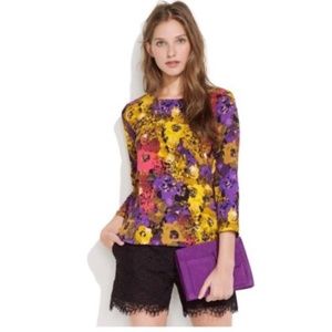 Size 8-Runs small, Painted print, Long sleeves with button cuffs, Sheer, Ruffle placket, Button down front, Crinkled gauzy sheer material, Bust approx. 19”, Length approx. 25”, Pre owned EUC!