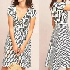 wrap midi dress, black and white, stripe dress, short sleeve wrap, classic, preppy, quiet luxury, nautical, coastal, beachy, vacation, resort wear, comfy, stretchy