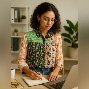 Vibrant long sleeve blouse by Maeve from Anthropologie — size Medium. Eye-catching patchwork design with a mix of abstract prints in bold colors. Button front, high-low hem, and lightweight 100% rayon fabric make it perfect for work or play.