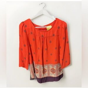 Add a pop of color to your wardrobe with this vibrant Maeve by Anthropologie blouse. Crafted in a bold red with subtle floral medallion accents, this peasant-style top features a unique bohemian border print at the hem and 3/4 sleeves. The back button detail and flowy silhouette make it both chic and comfortable, perfect for pairing with jeans, skirts, or trousers.