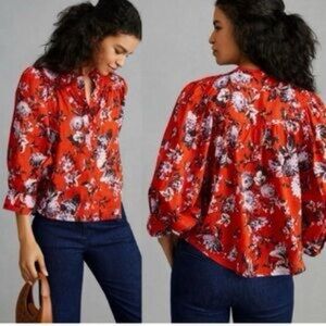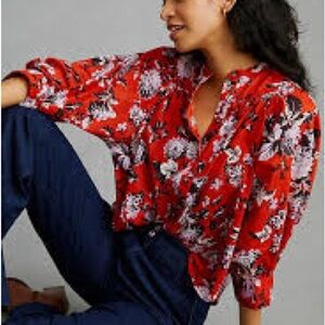 This relaxed blouse from Anthropologie features a striking red and lilac graphic design, complemented by a mandarin collar and 3/4 balloon sleeves. The lightweight fabric ensures a comfortable fit, making it perfect for a stylish yet casual look. Two buttoned cuff and front buttoned down.