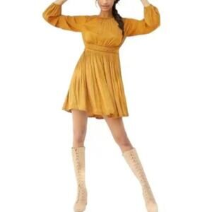 Maeve Anthropologie Saniya Pleated Long Sleeve Mini Dress in Gold. Has an extra button on material tag, pockets, elastic waist, buttoned cuffs and keyhole in back.