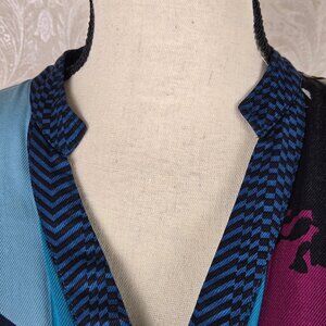 Colorful abstract design swing dress has a split vneck design with buttons on the chest. The skirt flares out and ends in a contracting ruffle tier. Long sleeves have a button at the cuff. Pockets on the sides. Unlined.