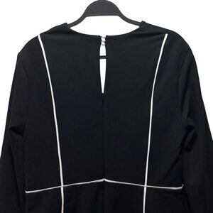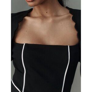 A refined mini dress featuring a square neckline, scalloped hem, and contrast piping. Crafted for an elegant silhouette with long sleeves and back closure detail.