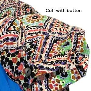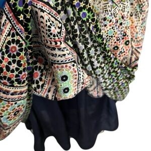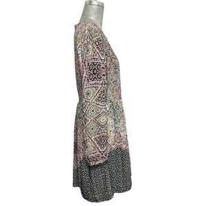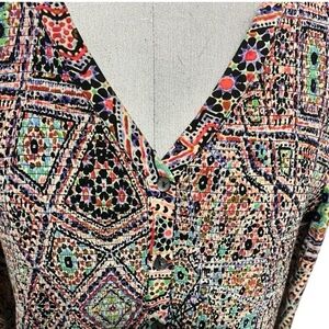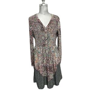 This Maeve dress features a flattering fit and flare silhouette with a v-neckline and long sleeves, perfect for casual or work occasions. The dress showcases a harmonious blend of bright colors in a bohemian-inspired print, complemented by a flowy, skirt for added elegance.