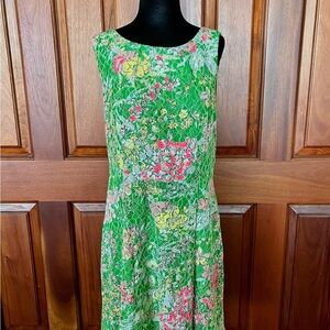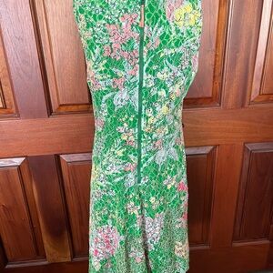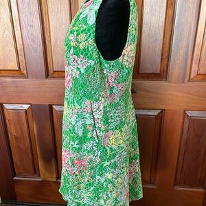 This fit-and-flare mini dress features a green lace overlay with a floral pattern in shades of pink, yellow, and white. The dress also has fluorescent pink sequin embellishments, side pockets, and a back zipper. The dress is sleeveless with a rounded neckline and a defined waist.