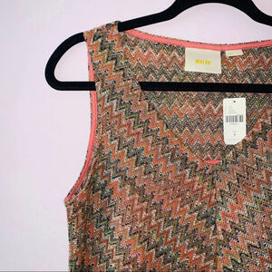 Brand new Mauve Anthropologie Westwater chevron knit dress. New with tags & in perfect condition! V neckline. Sleeveless. Step bottom hem. A-line fit. Knee length. Fully lined. Heavyweight knit material. Brown with pink & multicolor chevron print. Size small.