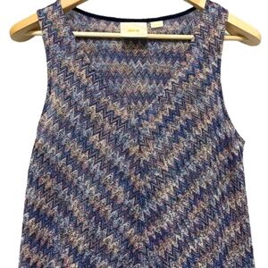 This gorgeous Maeve Anthropologie Westwater dress is a must-have for the fashionable woman. The dress features a stylish chevron pattern on a blue knit polyester fabric with a sleeveless design and a casual sleeve type. The dress has a V-neckline and a drop waist with a pullover closure for easy wear. It is perfect for casual occasions and can be worn in summer, fall, and spring seasons.