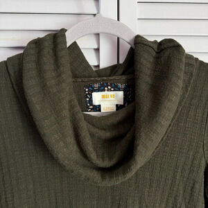 Anthropologie Maeve Winterscape Peplum Ribbed Cowl Neck Long Sleeve Top in Deep Olive Green.